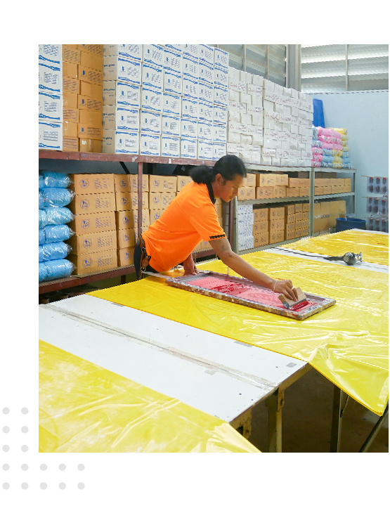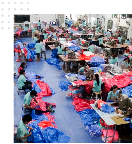 Today, we are well renowned as the leader among manufacturing plants of rainwear and baby bed sheet in Thailand who possesses genuine expertise and comprehensive line of production that meets export standards. Moreover, we have extended our product line to respond to different needs, such as Magic Pants, suit cover, apron, packaging, etc., which are marketed with the trademarks: “Rainny”, “Classic” , “Classic Rainwear”, “Classic Rainsuit”, “Classic Poncho”, “Cale” , “3LIONS” and so on.